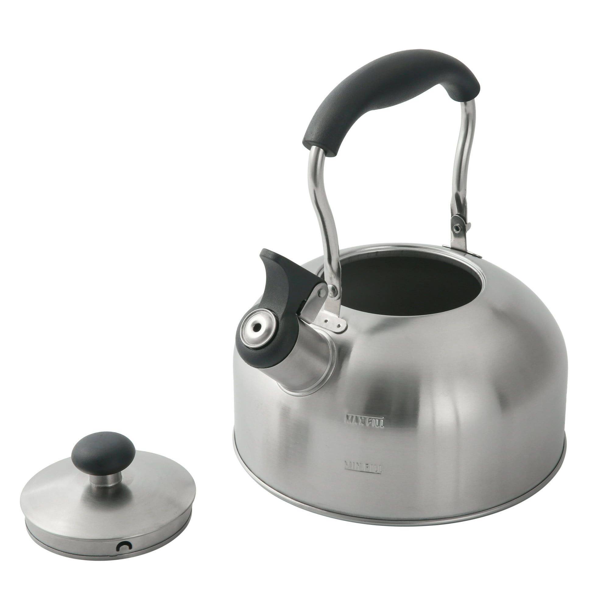 Tea time! Enjoy a cup of tea, coffee, or cocoa with the 1.8-liter stainless steel whistling tea kettle from . It heats on every kind of stovetop and has a removable lid with a handle to cover the fill opening. Made from durable stainless steel with an elegant brushed exterior finish, this kettle is sure to provide a quick and easy way to heat your water. Pouring is easier with a coated and contoured handle to offer a comfortable grip. When this tea kettle whistles, simply push down the lever to open the spout. There are also max and min fill lines for fill guidance.