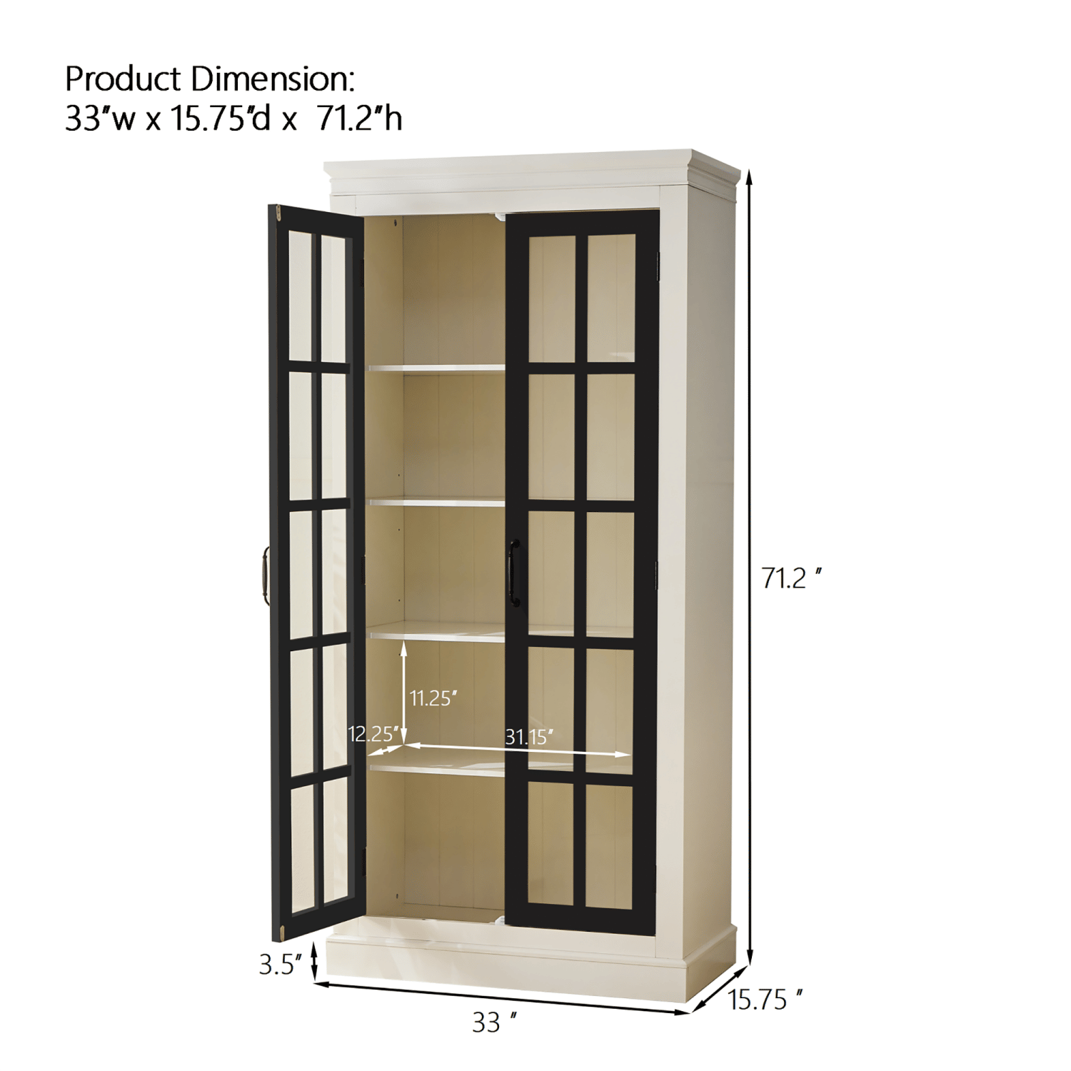 [Ample Storage Capacity]Boasting spacious dimensions of 33" W x 71.2" H x 15.75" D, this display cabinet features 2 adjustable shelves and 2 fixed shelves, offering plenty of room for books, photos, plants, and other decorative items. The tempered glass doors keep dust out while providing a clear view of your displayed treasures.