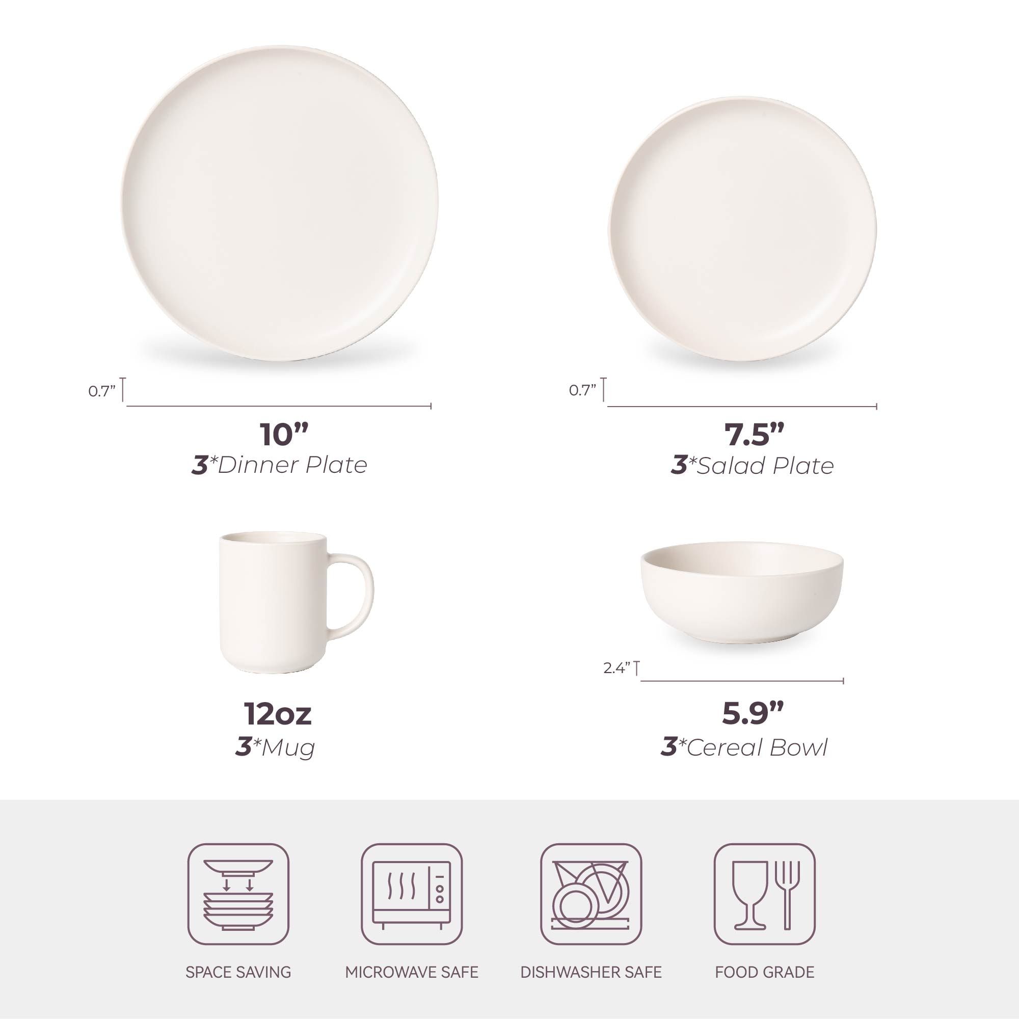2. "[Complete 12pc Service for 3]": "Includes 3 dinner plates (10\"), 3 salad plates (7.5\"), 3 cereal bowls (5.9\"), and 3 mugs (12oz) - perfect for small families or couples."
