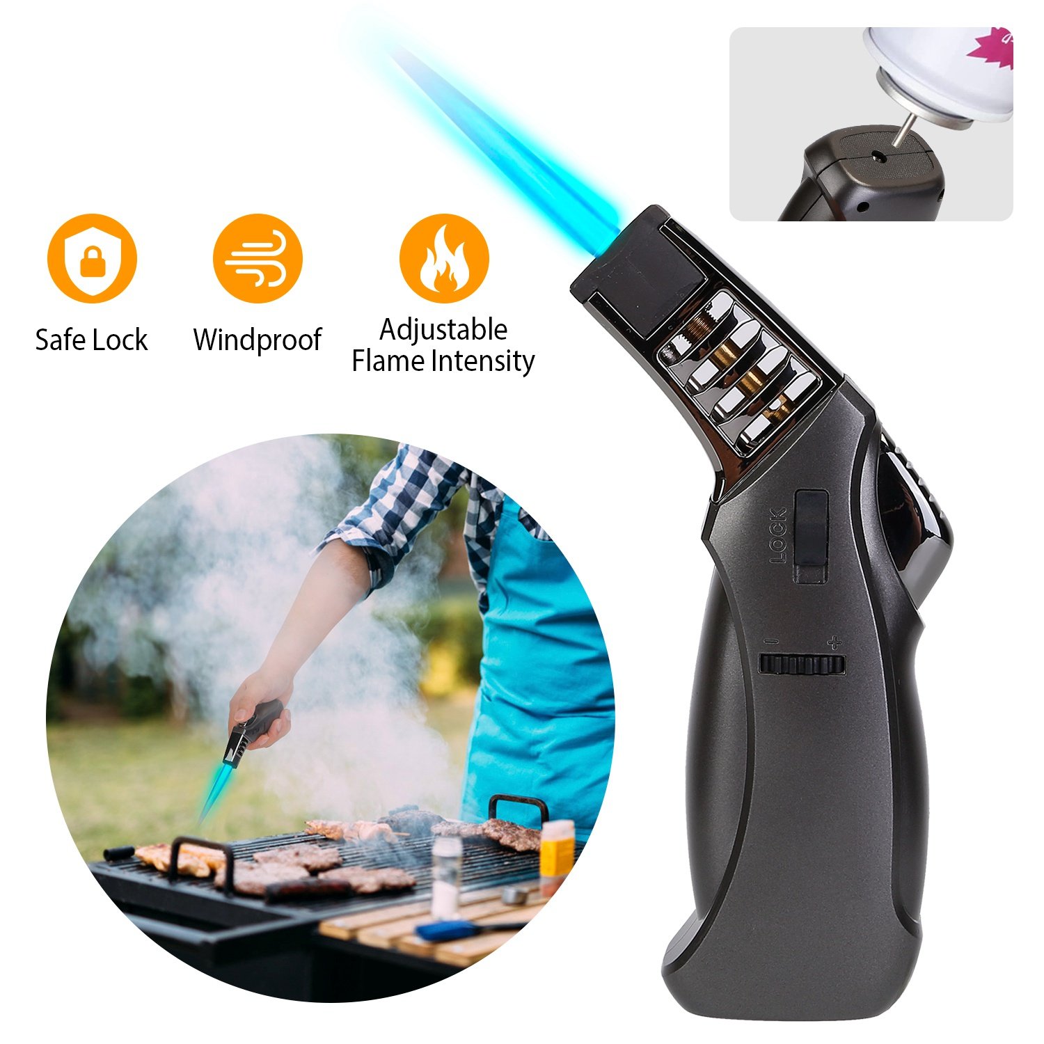 Do you need a professional cooking torch for your creme brulee, BBQ or DIY? Our premium cooking blow torch is a good helper for you! Not only ideal for caramelizing sugar atop creme brulee, but also great for soldering DIY jewelry, lighting fire and cigar, etc.. The flame intensity can be adjusted easily according to your needs. Safety lock ensures security to prevent accidental ignition. You can take it for outdoor activities for its portable mini size.