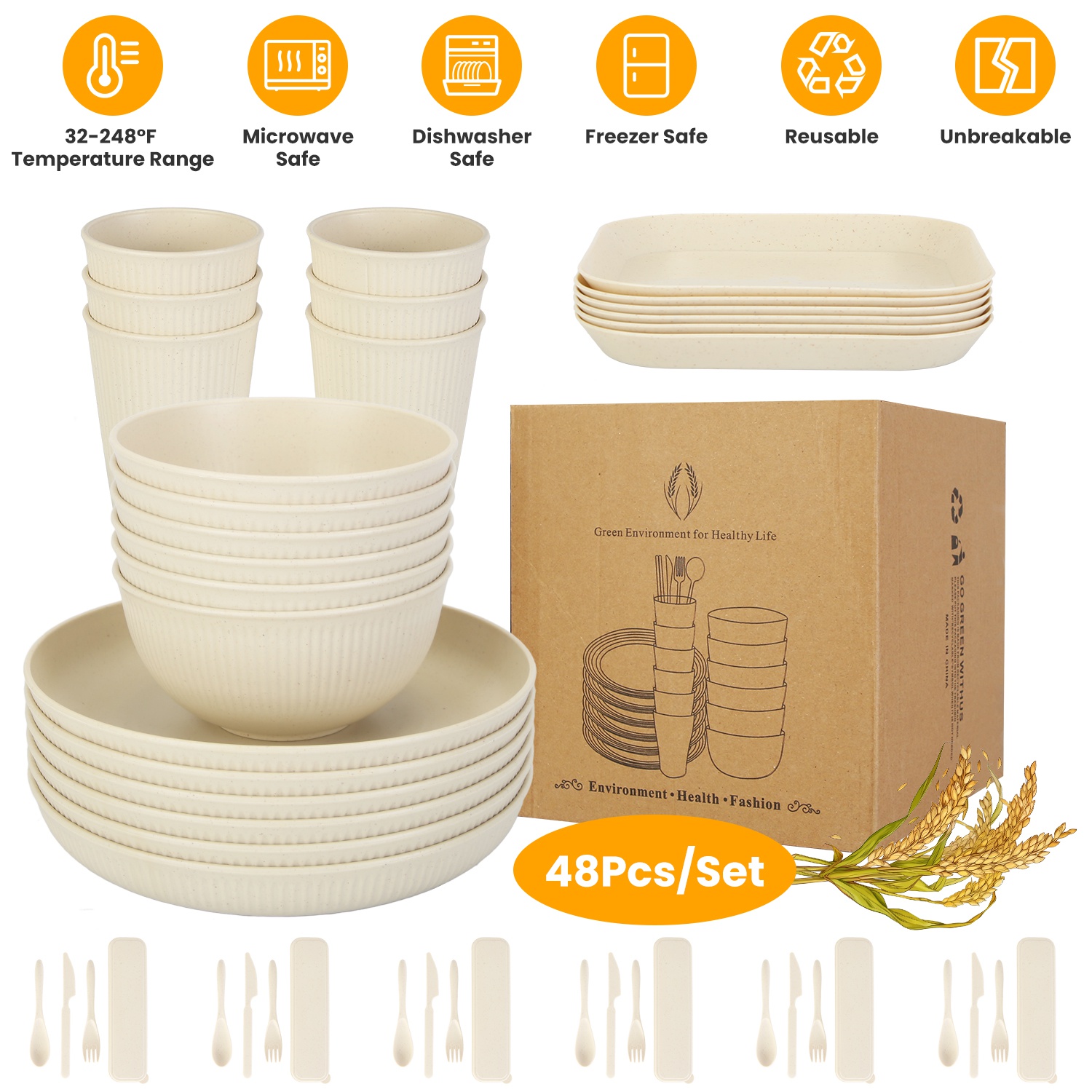 Home > 48Pcs Wheat Dinnerware Set Reusable Plastic Dinnerware Set Service for 6 Unbreakable Kitchen Cups Plates and Bowls Sets Dishwasher Microwave Freezer S
