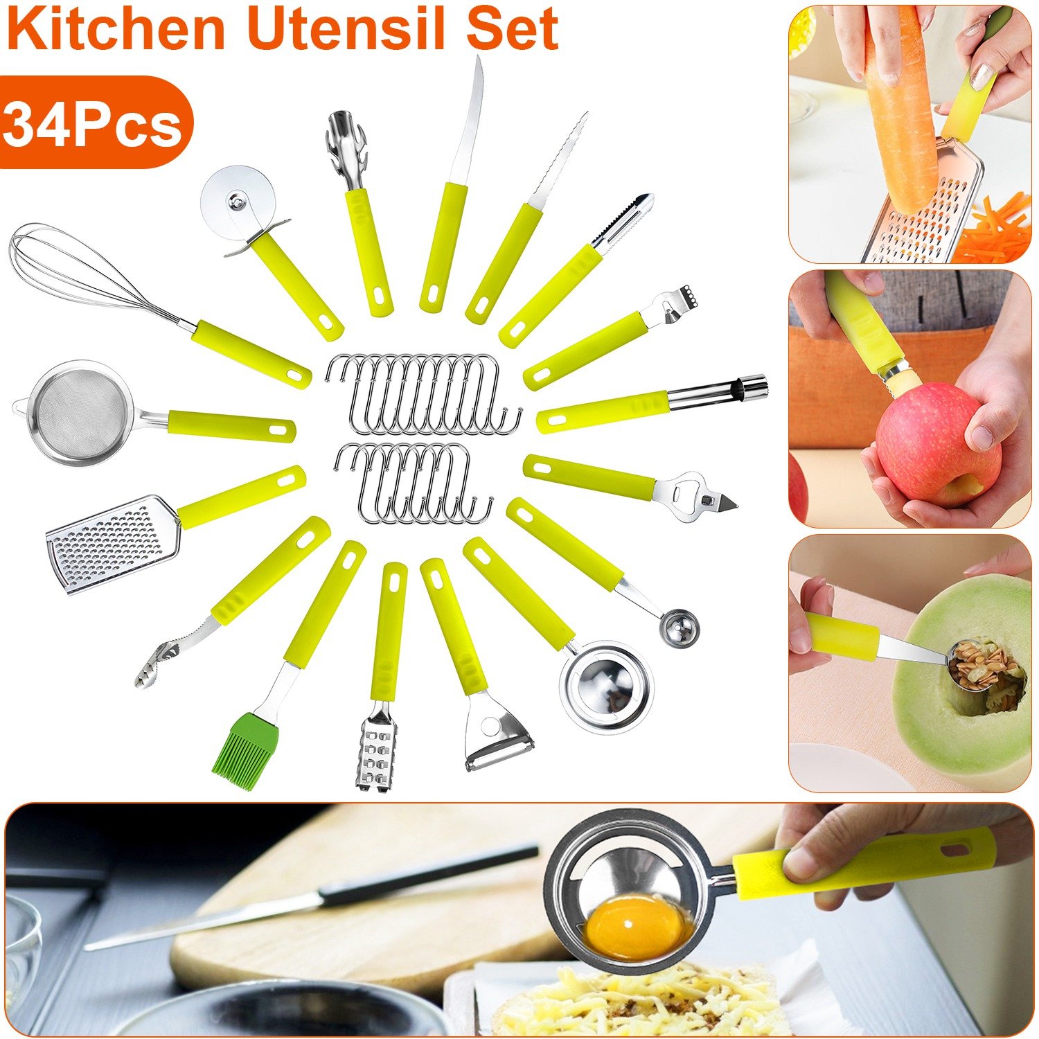 Do you enjoy cooking and baking for your intimate friends and lovely family members? This 34Pcs kitchen utensil set can facilitate your work effectively. Processing fish, fruit, vegetables, eggs, and so on is no more difficult. Easy to clean, durable and hanging with hooks for space saving!