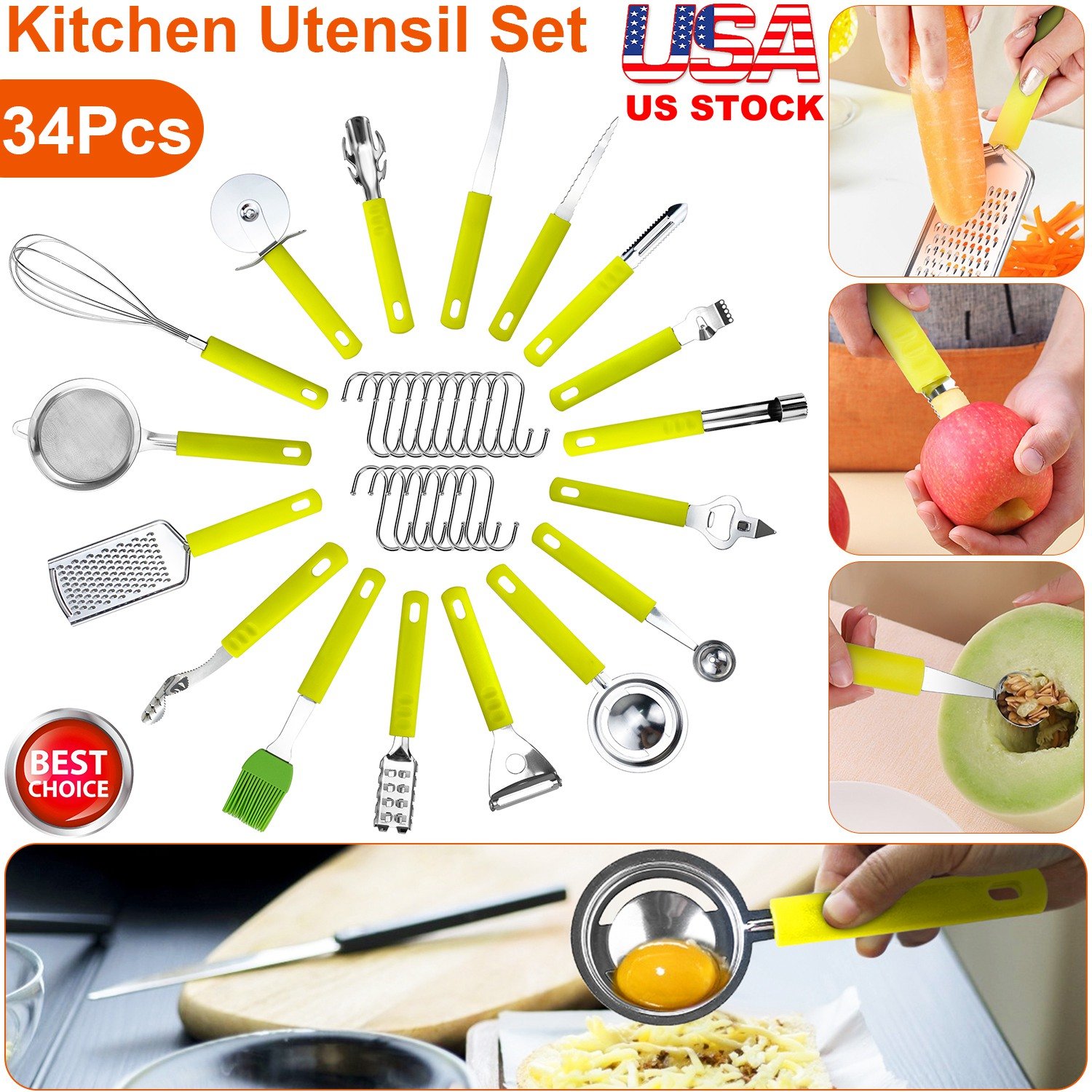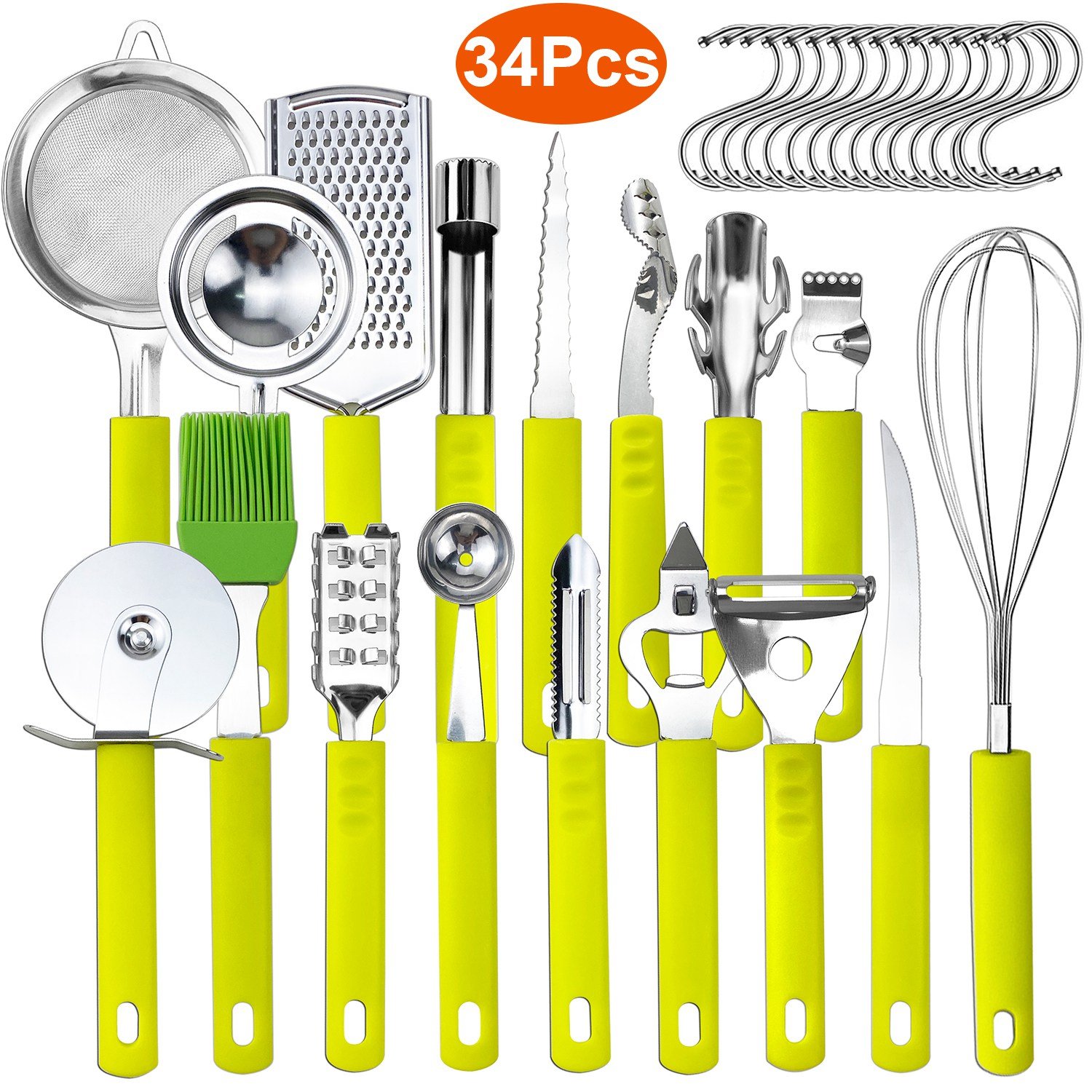 34 Pcs Kitchen Cooking Utensils Set Stainless Steel Kitchen Gadget Tools Core Removal Potato Peeler Whisk Pizza Cutter Steak Knife Bottle Opener