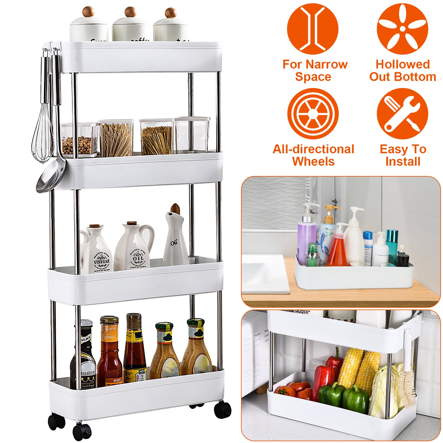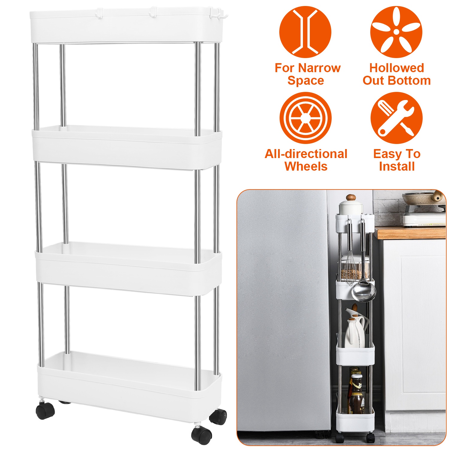 Are you tired of messy room which is full of objects? Are you always wasting too much time on finding supplies and necessities? This 4-Tier slim storage cart is a perfect solution to utilize narrow space to store a great deal of things, space-saving and time-saving. The cart has all-directional wheels that can be locked for stability when moving items on and off of the cart. Just slide it into the closet when not in use. A convenient time-saver to have in office, break room, kitchen, bathroom, and etc..